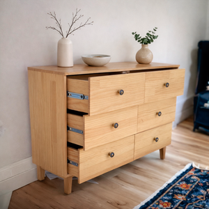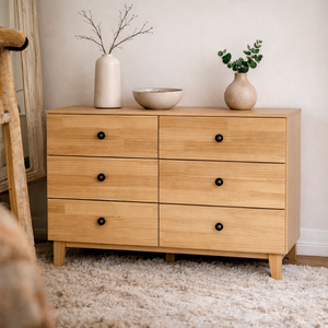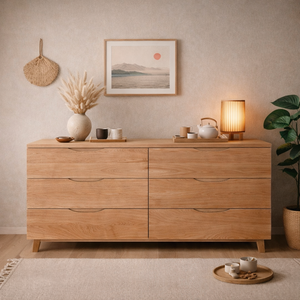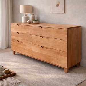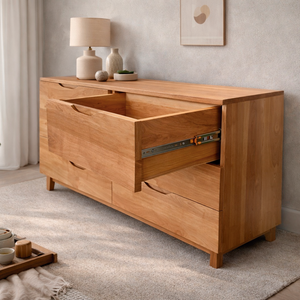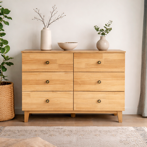 Cómoda Dairune, hecha a mano en Lenga o Pino Clear, de líneas simples y proporcionada equilibradamente. Su diseño sobrio resalta la veta natural de la madera, con cajones amplios de deslizamiento suave y tiradores discretos que aportan carácter sin romper la armonía. Ideal para dormitorios o livings, combina calidez, funcionalidad y un estilo atemporal cercano al Japandi.