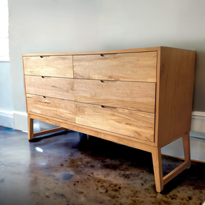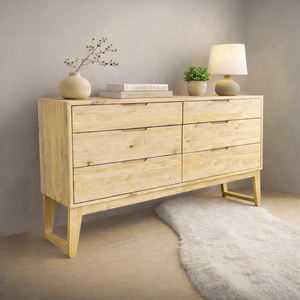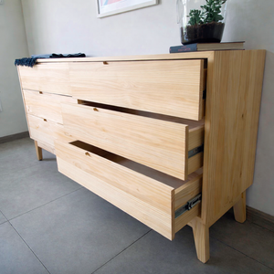 Hecha a mano en pino seleccionado o lenga premium, con seis cajones y uñeros tallados en la madera. Su diseño Japandi de líneas limpias y patas en ángulo realza la veta natural, aportando calidez y equilibrio al espacio.