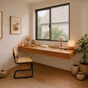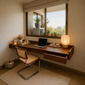 Escritorio flotante en madera de Lenga Premium, hecho a mano y con terminación natural que resalta su veta cálida.