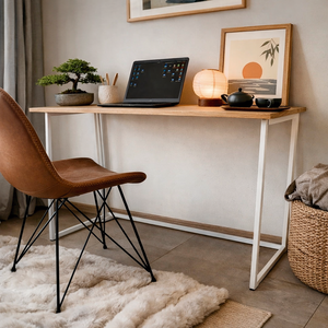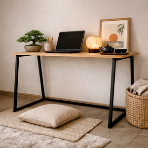 Escritorio Plegable estilo industrial, con cubierta de madera natural y patas metálicas electropintadas en blanco o negro. Diseño liviano, funcional y minimalista, ideal para Home Office y espacios reducidos.