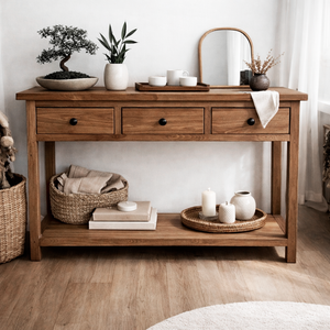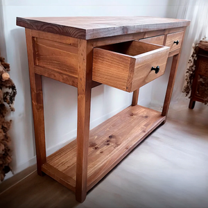 Fabricado en madera de pino, de estilo rústico, con líneas simples y cálidas. Destaca por su estructura sólida, tres cajones funcionales y una repisa inferior, ideal para aportar orden y carácter natural a recibidores o espacios de estar.