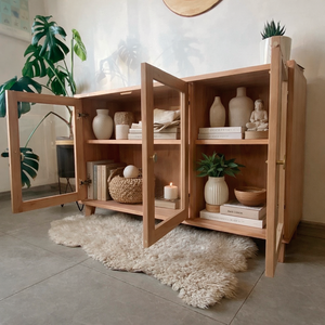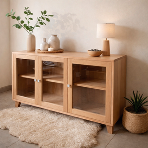 El Buffet Glass está hecho 100% en Lenga Premium, destacando por su veta suave y tonalidad cálida. Sus puertas con vidrio aportan ligereza visual y permiten exhibir libros y objetos con elegancia y orden.