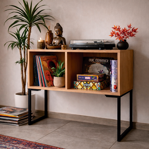 Diseñado especialmente para vinilos y objetos decorativos, ofrece compartimentos amplios que permiten organizar discos, libros o piezas especiales manteniendo una estética ordenada y sofisticada.