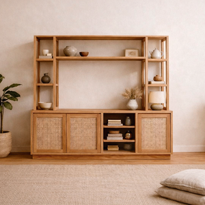 La base integra puertas con junco natural tejido, aportando textura, ventilación y un contraste orgánico que realza la nobleza de la madera. Cada detalle —ensambles, terminaciones y suavidad al tacto— refleja un trabajo artesanal cuidadoso.
