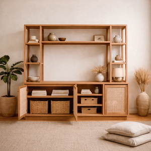 El Estante Aura es una pieza hecha a mano en Lenga Premium, seleccionada por su veta limpia, tono cálido y gran estabilidad. Su estructura combina líneas rectas y proporciones equilibradas, logrando una presencia liviana pero sólida, muy coherente con el estilo Japandi.