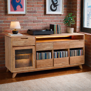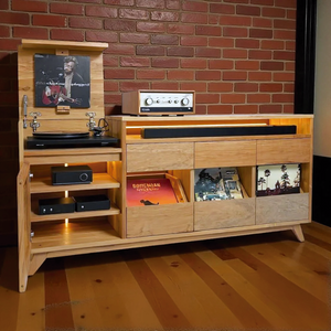 Es una pieza robusta, funcional y pensada para amantes del vinilo, donde la materialidad noble de la Lenga se combina con una lógica de diseño enfocada en experiencia y durabilidad.