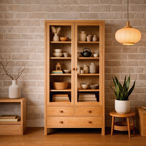 Hecha 100% a mano en madera de Lenga, destacando por su diseño limpio. Sus puertas de vidrio permiten exhibir con elegancia vajilla, libros u objetos decorativos, mientras que los cajones inferiores aportan funcionalidad y orden.