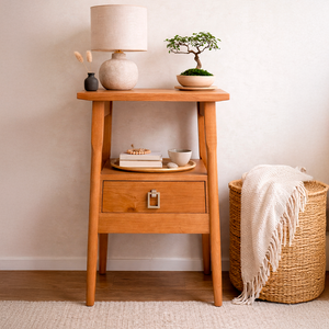 Velador de madera de Lenga, de lineas limpias y proporciones equilibradas. Su diseño sobrio y funcional aporta calidez y elegancia, integrándose con naturalidad en espacios estilo Japandi o nórdico.