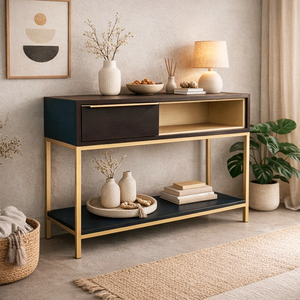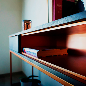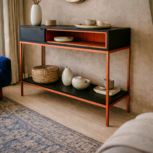 Arrimo industrial de diseño limpio, con estructura metálica en color cobre o bronce, electropintado y lacado, que entrega resistencia, durabilidad y un brillo sutil y sofisticado. Un mueble funcional y atemporal, perfecto para aportar carácter y equilibrio a cualquier espacio.