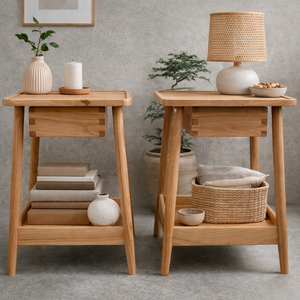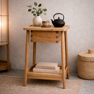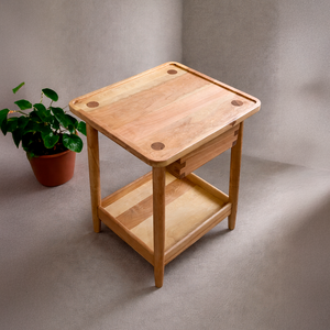 Velador hecho a mano en madera nativa de Lenga, de líneas simples y carácter Japandi. Incorpora unión cola de Milano en su cajón, reflejo de una ebanistería precisa y duradera. Una pieza funcional y atemporal que resalta la belleza natural de la madera y el valor de lo artesanal.