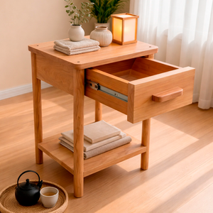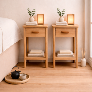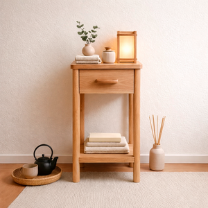 Velador hecho a mano en madera de Lenga, con tirador de Raulí que aporta un sutil contraste. Su diseño limpio y proporciones pequeñas es ideal para espacios reducidos, entregando cálidez, funcionalidad y equilibrio.